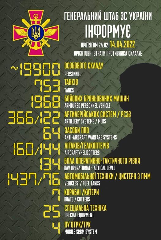 Загальні бойові втрати противника з 24.02 по 14.04 орієнтовно склали