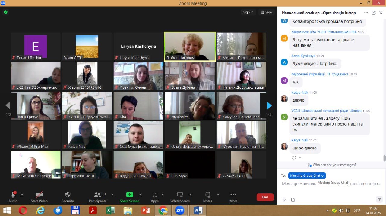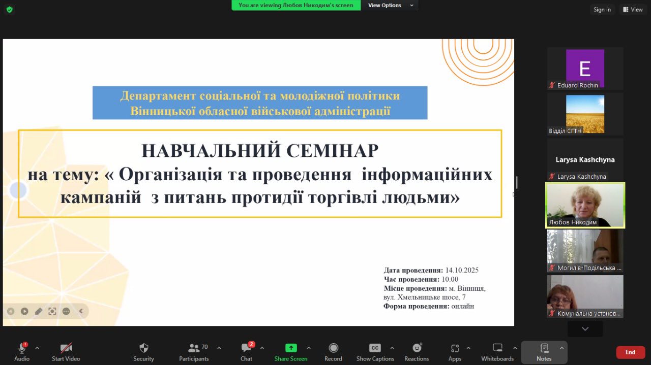 У рамках навчального семінару обговорили основні принципи, ключові завдання та основні етапи інформаційних кампаній у сфері протидії торгівлі людьми. Надали практичні поради. Акцентували увагу на тому, що ефективність інформаційних кампаній значною мірою залежить від рівня підготовки фахівців, які працюють у громадах та районних військових адміністраціях. Посадові особи саме на місцях є першими, хто стикається з проявами торгівлі людьми, бачить проблеми у громадах і має змогу донести важливу інформацію до населення.