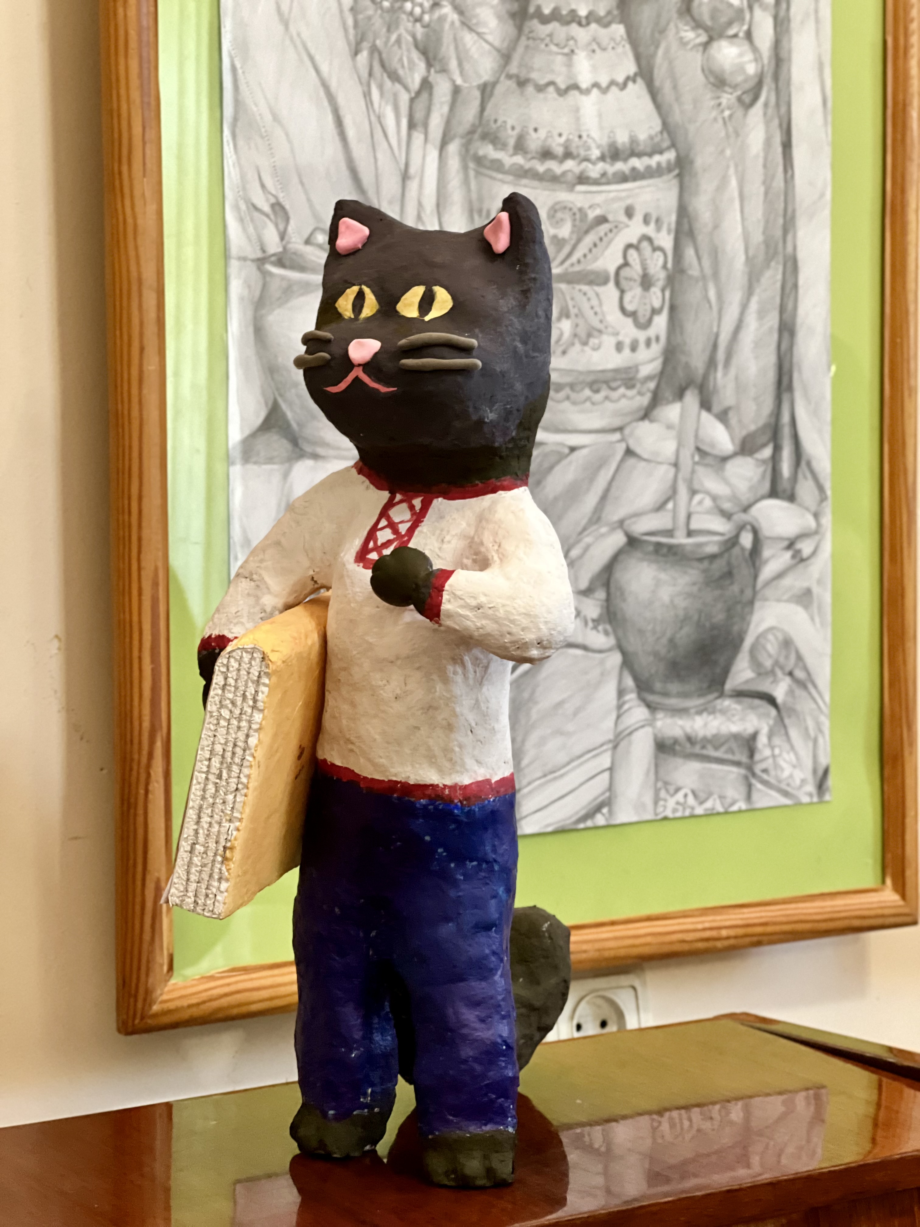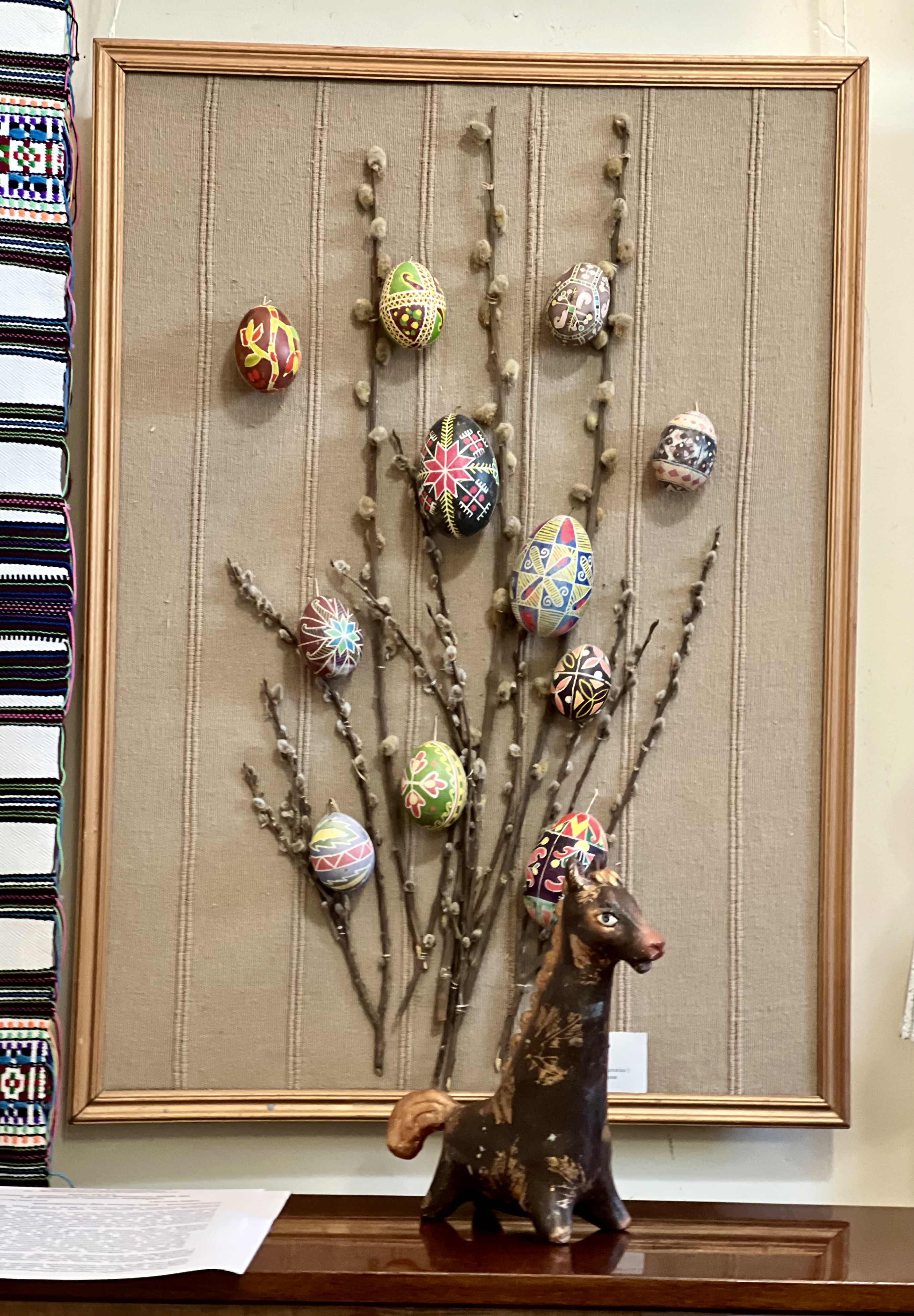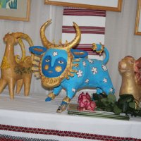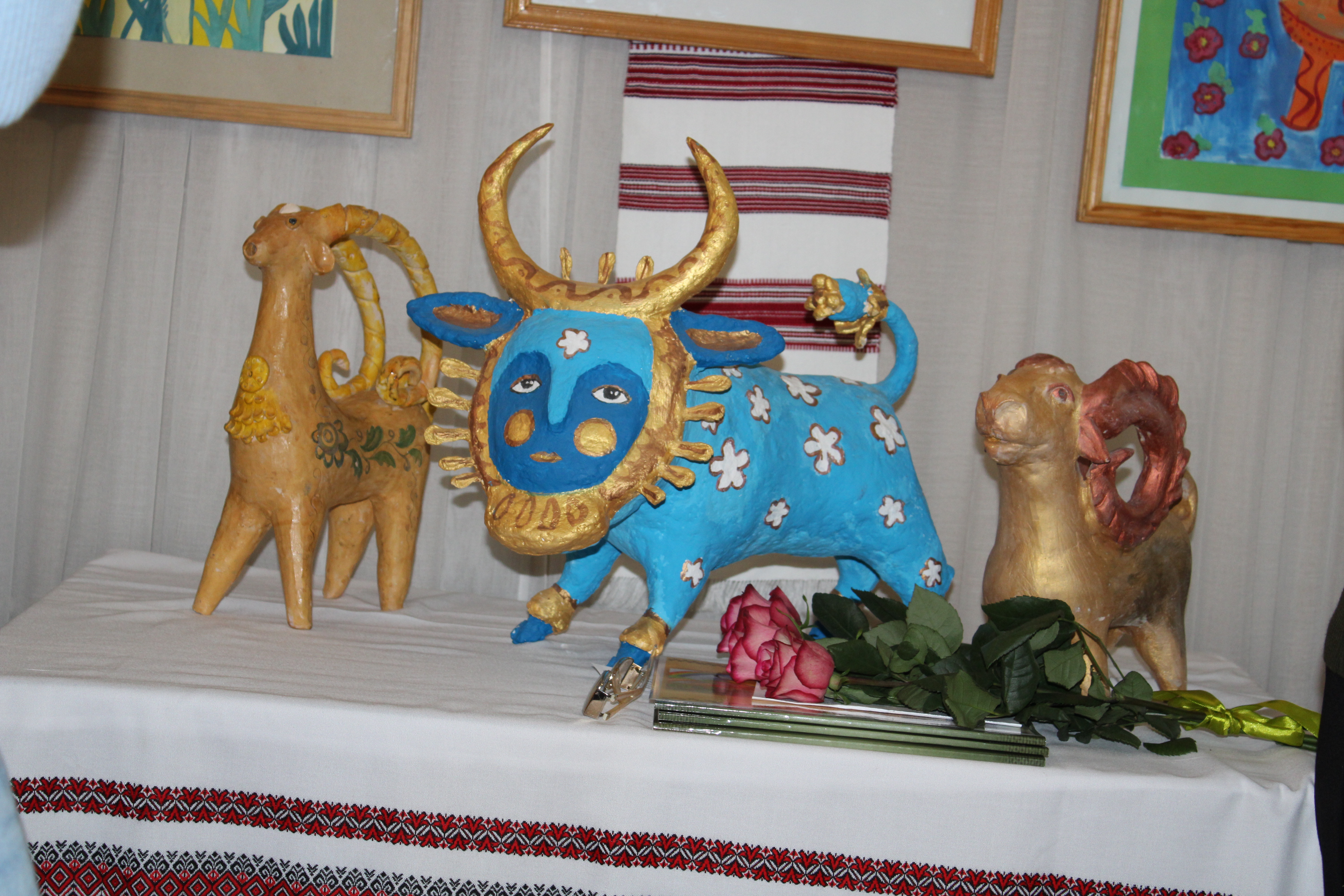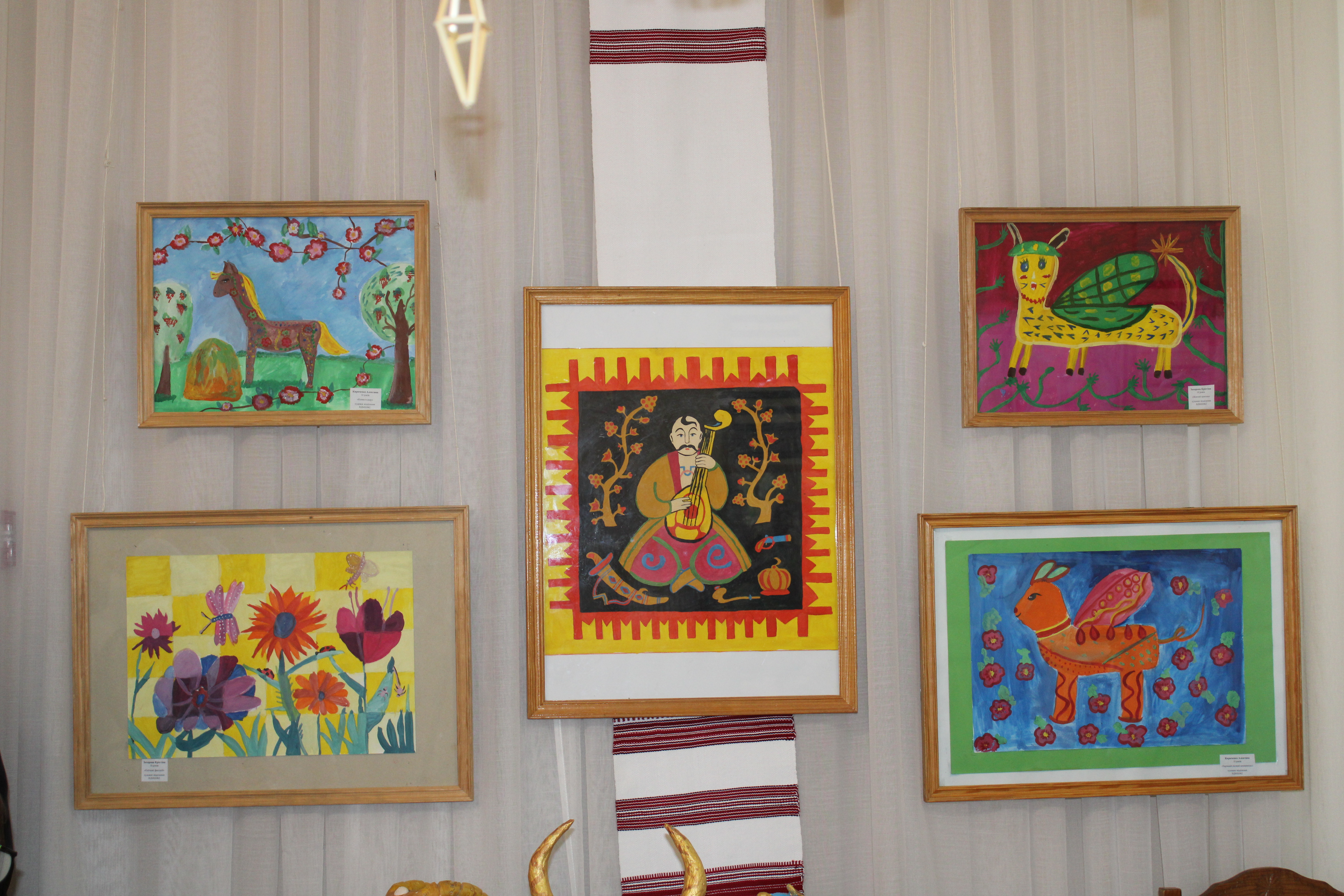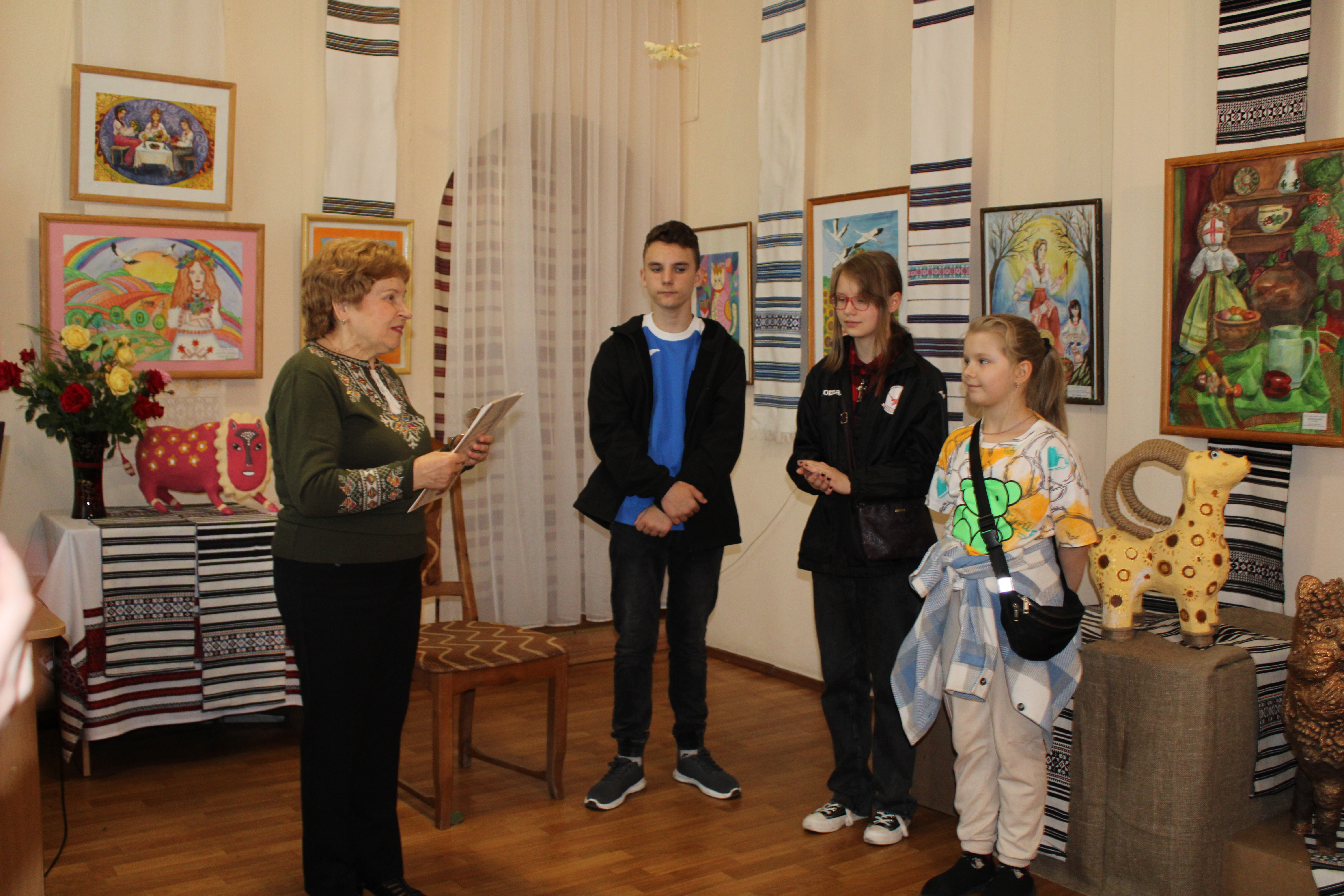 Ця дитяча виставка не випадково називається «За мотивами народних майстрів», адже основою її експозиції є обрані композиції з скульптур і картин Марії ПРИМАЧЕНКО, знищення окупантами музею якої болісно відгукнулось серед українців та культурної спільноти усього світу. Також на виставці є роботи, створені за роботами Василя ОМЕЛЯНЕНКА, Степана ГАНДЖІ та інших відомих майстрів народного мистецтва. А ще представлені писанки, іграшки з глини і паперової маси, картини декоративного розпису, народного малярства, рельєфного ліплення та витинанки.