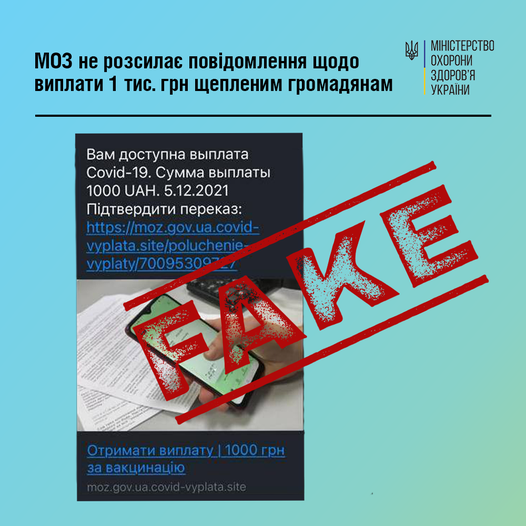 У мережі поширюються неправдиві повідомлення нібито від імені Міністерства охорони здоров’я, в яких пропонують користувачам надати контактні дані для виплати 1 тис. грн особам, які завершили повний курс щеплення від COVID-19.
