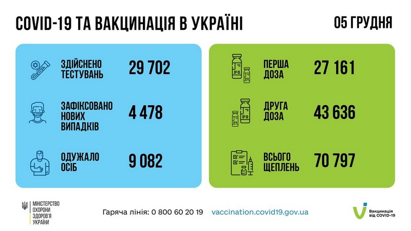 За добу 05 грудня в Україні зафіксовано 4 478 нових підтверджених випадків коронавірусної хвороби COVID-19 (з них дітей – 429, медпрацівників – 52); 70 797 людей вакциновано проти COVID-19. Першу дозу отримали 27 161 людина, повністю імунізовані – 43 636 людей.