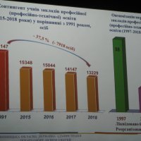 Валерій Бачинський в своїй доповіді порівняв контингент учнів закладів професійної (професійно-технічної) освіти 2015-2018 років з контингентом 1991 року – за його словами, мережа зазнала зменшення на 37,5% тоді, як за цей період реорганізовано 5 закладів та 6 філій. Позитивна тенденція спостерішгається в плані розширення переліку професій: в 2013 році – 107, а в 2017 році – 121. Доповідач наголосив, що регіональне замовлення у 2017 році виконано на 80% (5113 осіб) при плані 6330 осіб. Разом з тим, на базі 6 закладів професійно-технічної освіти створено 7 навчально-практичних центрів. Також керівник зазначив про необхідність розширення переліку професій загальнодержавного значення та необхідність формулювання умов передачі майна ПТНЗ у власність територіальних громад.