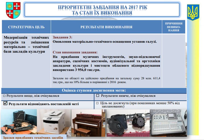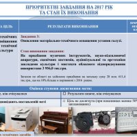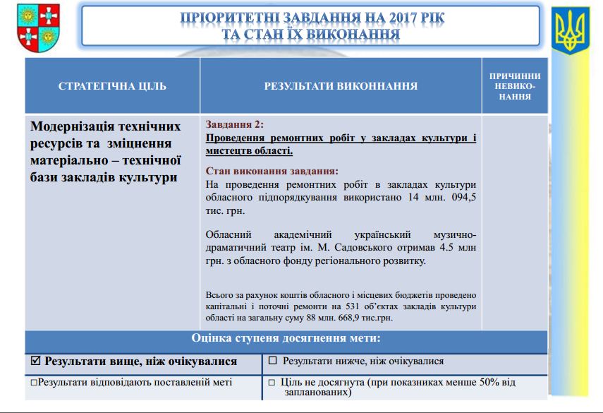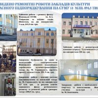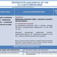 Загалом по області за рахунок коштів обласного іі місцевих бюджетів проведено капітальні і поточні ремонти на 531 об’єкті закладів культури області на загальну суму 88 млн. 669 тис. грн. В цілому цей показник зріс на 9% в порівнянні з показниками 2016 року.