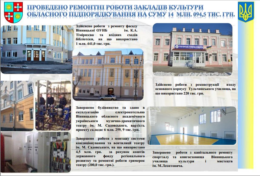 Також керівник детально поінформував присутніх щодо будівельних робіт у приміщенні Вінницького обласного українського академічного музично-драматичного театру ім. М. Садовського. Зокрема, мова йшлась про будівництво та введення в експлуатацію електрокотельні театру, вартість робіт із встановлення якої складає 6 млн. 260 тис. грн. Окрім того, завершуються роботи з монтажу системи кондиціонування та вентиляції театру ім. М. Садовського, на що використано 4,5 млн. грн. за рахунок коштів державного фонду регіонального розвитку.