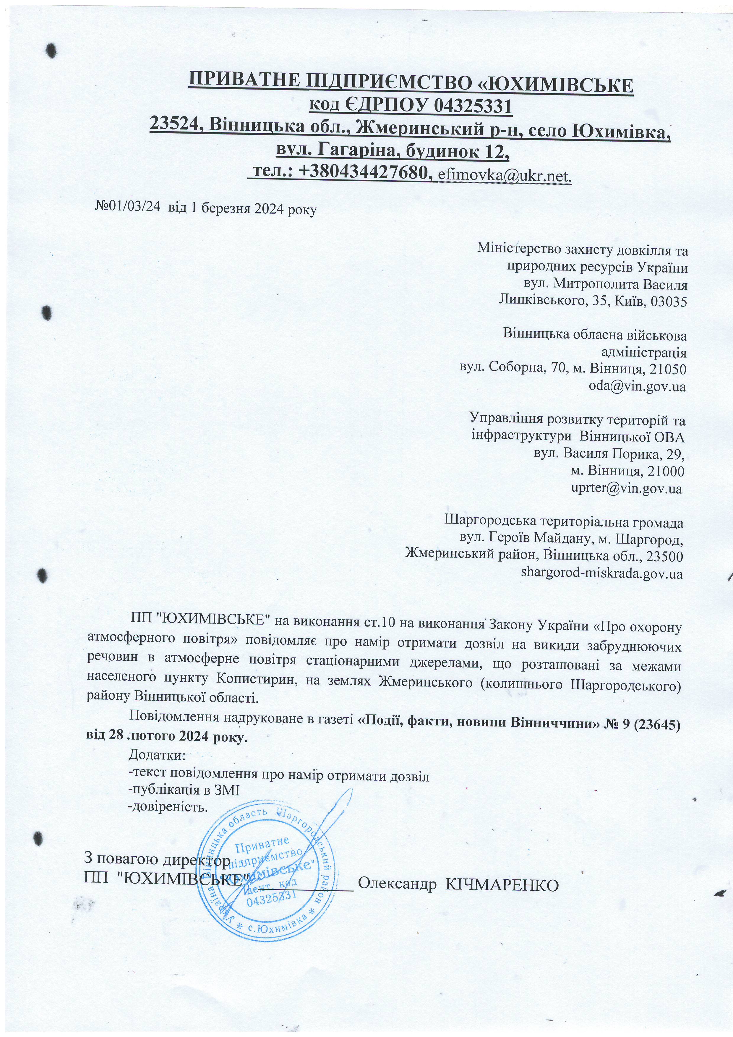 Місце знаходження суб’єкта господарювання, контактний номер телефону, адрес електронної пошти суб’єкта господарювання - 23524, Вінницька обл., Жмеринський (бувший Шаргородський) р-н, село Юхимівка, вул. Гагаріна, будинок 12, тел.:+380434427680,