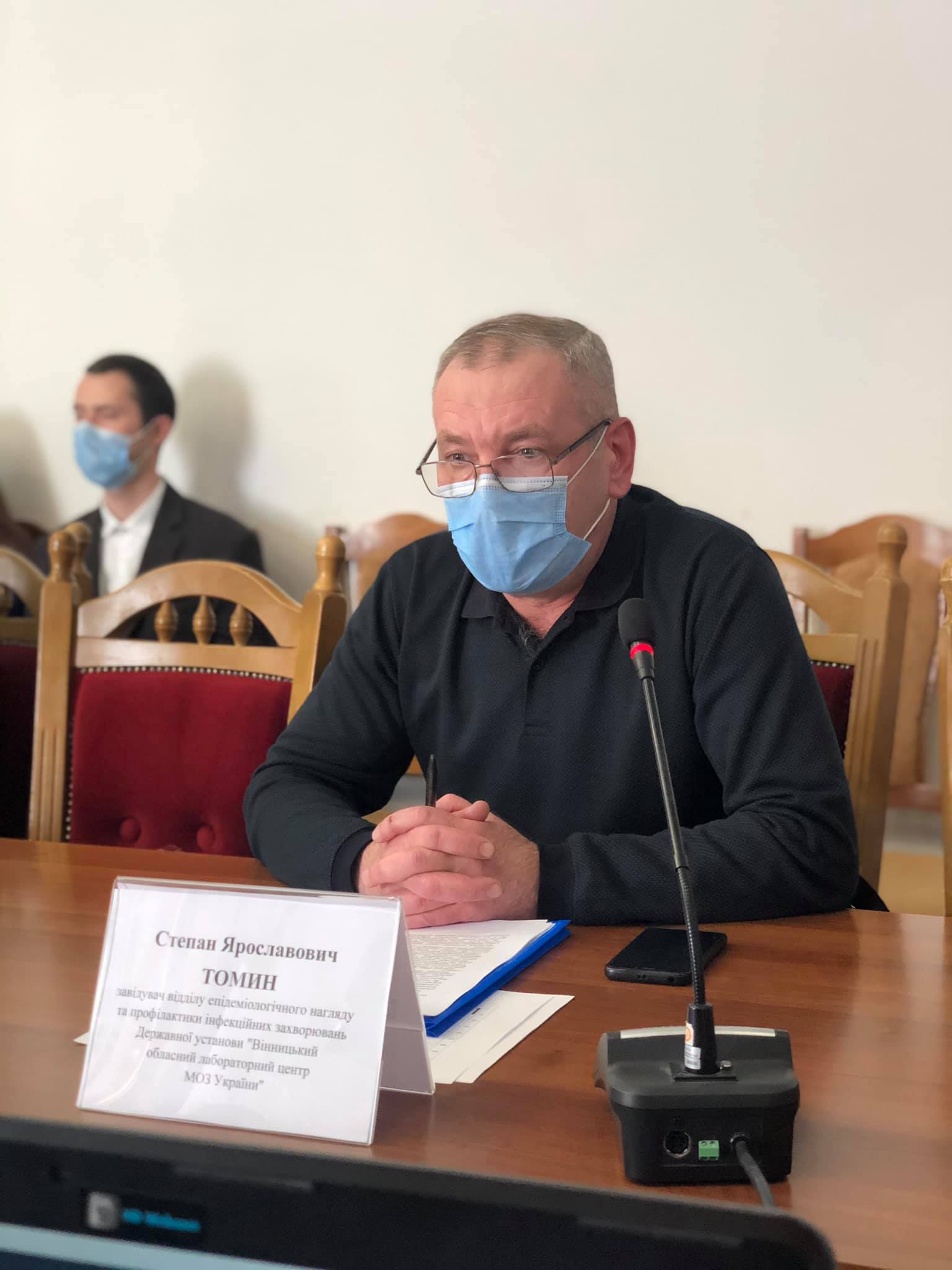 Завідувач відділу епідеміологічного нагляду та профілактики інфекційних захворювань Державної установи «Вінницький обласний лабораторний центр МОЗ України» Степан Томин проінформував про поточну ситуацію із захворюваності на коронавірус в області та надав детальну інформацію щодо забезпеченості закладів, що надають допомогу хворим на Сovid-19.